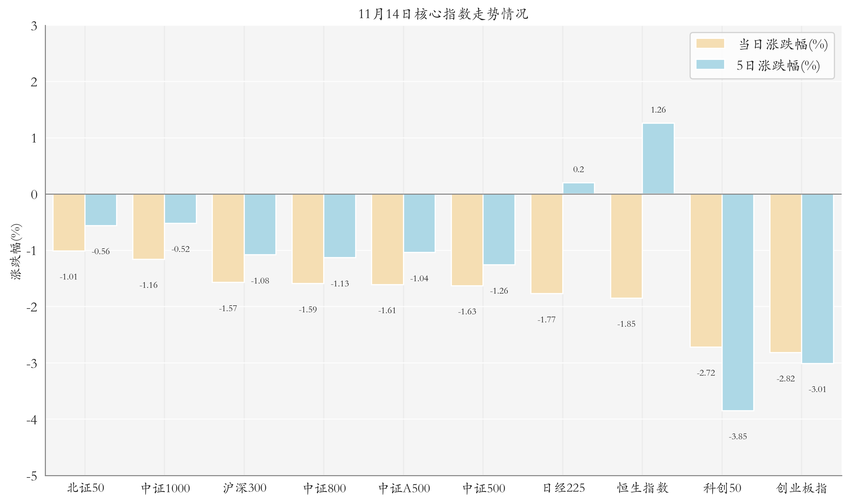 统计A股与海外主要核心指数走势,今日(11月14日,下同)三大指数集体下跌,其中上证指数下跌0.97%,收于3990.49点,日内最高4034.08点;深证成指下跌1.93%,收于13216.03点,日内最高13394.06点;创业板指下跌2.82%,收于3111.51点,日内最高3167.11点。今日北证50、中证1000与沪深300走势排名靠前,日涨跌幅分别为-1.01%、-1.16%与-1.57%;近5个交易日恒生指数、日经225与中证1000的走势排名靠前,近5日涨跌幅分别为1.26%、0.2%与-0.52%。