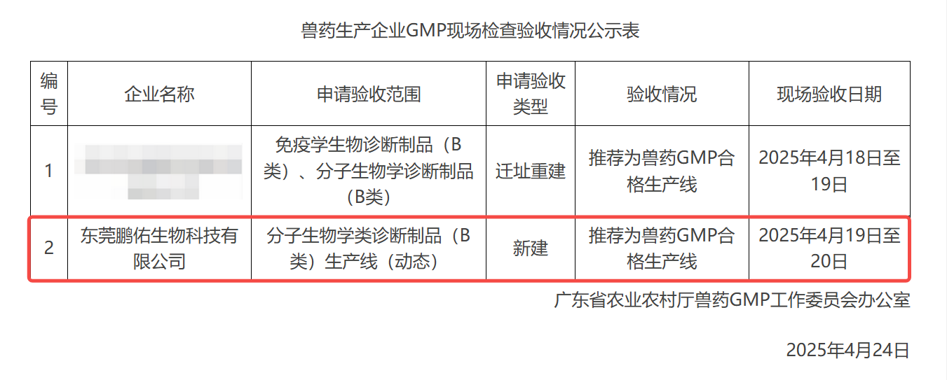 近日,东莞鹏佑生物科技有限公司(以下简称“鹏佑生物”)宣布正式获得广东省农业农村厅颁发的《兽药GMP证书》及《兽药生产许可证》。这是东莞市颁发的首张兽用诊断试剂GMP证书,标志着鹏佑生物在生产质量管理体系建设上迈出关键一步,为后续参与宠物医疗市场竞争提供了坚实保障。